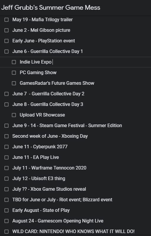 آقای Jeff Grubb یکی از نویسندگان سایت VentureBeat در یک رشته توییت که آن را Summer Game Mess نامگذاری کرده (و همچنین آن را به صورت یک گزارش در سایت ذکر شده هم منتشر کرده) است، برنامهای از رویدادهای مهم حوزهی بازیهای ویدیویی در ماههای آینده به اشتراک گذاشت که در بین آنها، رویدادی از سوی شرکت سونی به چشم میخورد. گراب اولین بار حدود هشت روز پیش این لیست را به اشتراک گذاشت که البته بهمرور دستخوش تکامل و البته تغییراتی شد که این رویداد پلیاستیشن هم جزو آنهاست.
