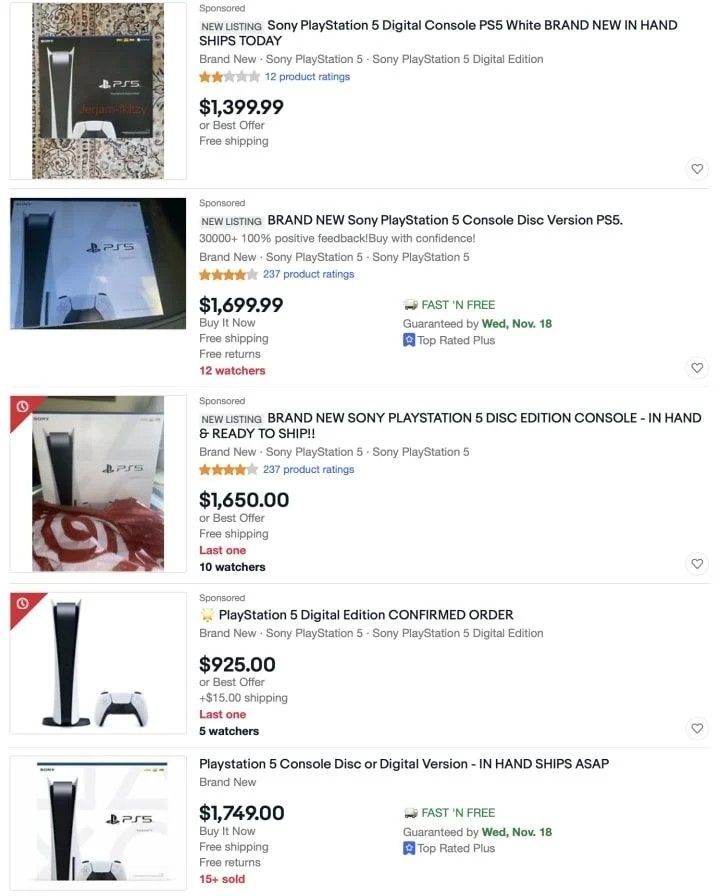 طبق بررسیهایی که وب سایت IGN انجام داده، قیمت پلیاستیشن 5 در بازار آزاد حدود سه و برخی اوقات چهار برابر قیمت واقعی است. آمازون در حال حاضر و بنا به دلایلی نامشخص اجازهی فروش جدیدترین کنسول سونی را نمیدهد اما eBay چنین قابلیتی را برای فروشندههای ثرد پارتی فراهم کرده است. از آنجایی که تعداد کنسول عرضه شده زیاد نیست و eBay هم به فرد فروشنده آزادی عمل کاملی را در قیمتگذاری داده است رقمهای گزافی را شاهد هستیم؛ برای مثال، فردی مدل دیجیتالی را با قیمت ۹۲۵ دلار برای فروش گذاشته در حالی که بهای رسمیاش ۳۹۹ دلار است. مدل استاندارد شرایط وخیمتری دارد و یکی از کاربران قیمت هزار و ۷۴۹ دلاری را برایش در نظر گرفته که حدودا چهار برابر بهای رسمی است.