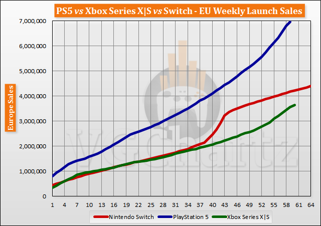 سهم آمار فروش کنسول پلی استیشن 5 در اروپا ۴۷.۴ درصد، نینتندو سوییچ ۲۸.۴ درصد و ایکس باکس سری ایکس – اس ۲۴.۲ درصد بوده است.