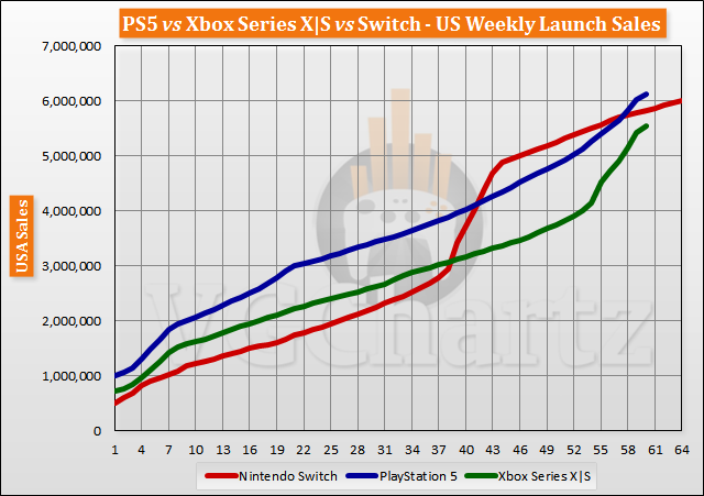 اما رقابت در آمار فروش کنسول پلی استیشن 5 در مقابل ایکس باکس سری ایکس – اس و نینتندو سوییچ بسیار نزدیکتر و حساستر است. در اینجا پلی استیشن 5 ۰.۲۹ میلیون از نینتندو سوییچ و ۰.۵۸ میلیون از ایکس باکس سری ایکس – اس فروش بیشتری داشته و همچنان در صدر جدول قرار دارد. سهم فروش کنسولهای پلی استیشن 5 در بازار آمریکا ۳۵ درصد، نینتندو سوییچ ۳۳.۳ درصد و ایکس باکس سری ایکس – اس تنها ۳۱.۷ درصد است.
