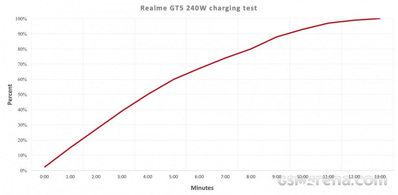 این شارژر سریع ریلمی در تستهای صورت گرفته توانست در مدت ۱۲ دقیقه و ۱۰ ثانیه، گوشی پرچمدار این شرکت چینی را کاملاً شارژ کند در حالی که خود ریلمی اعلام کرده بود مدت زمان مورد نیاز برای شارژ این محصول ۱۰ دقیقه است که البته این تفاوتها در بررسی و ادعای شرکت عادی است. با این رکورد استثنائی، همچنان یک گوشی دیگر وجود دارد که سریعتر از ریلمی GT5 شارژ شود و آن، ریلمی GT3 با ثبت رکورد ۱۱ دقیقه است. GT3 هم از باتری و هم شارژر با ظرفیت و سرعت مشابه بهره میبرد.