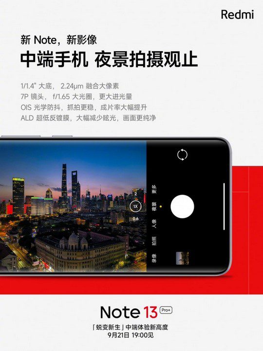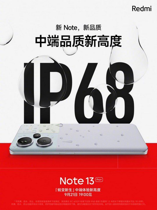 ردمی نوت ۱۳ پرو پلاس قرار است به دوربین ۲۰۰ مگاپیکسلی با لرزشگیر اپتیکال و گشودگی دیافراگم بیشتر، استاندارد ضد آب IP68 (برای نخستین بار روی یک گوشی میانردهی شیائومی شاهد این استاندارد هستیم)، نمایشگری با خمیدگی بسیار نامحسوس و پردازندهی دایمنسیتی ۷۲۰۰ اولترا مجهز شود.