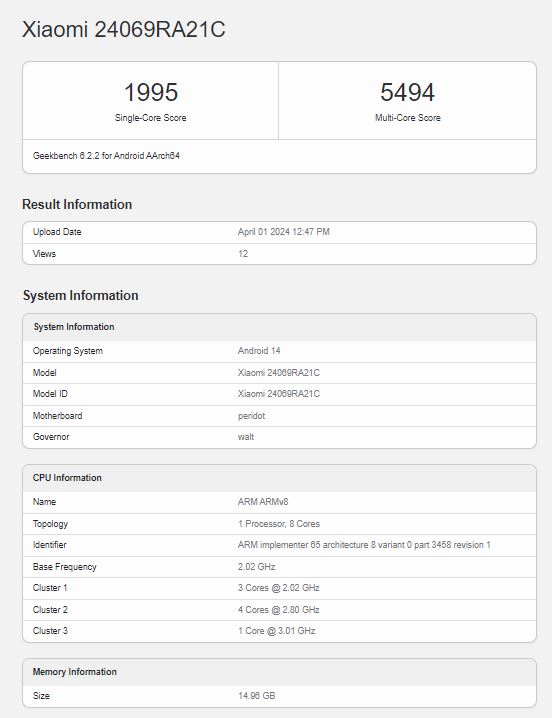 اینطور که از نتایج تست پیداست، ردمی توربو 3 توانسته در بخش تک و چند هستهای امتیاز عالی 1995 و 5494 را کسب کند. در این لیست، سرعت هستهها و همچنین نوع گرافیک را هم شاهد هستیم (آدرنو 735). بدین ترتیب یعنی قلب تپندهی پوکو F6، اسنپدراگون 8s نسل 3 خواهد بود. در کنار این تراشه، 16 گیگابایت رم هم حضور دارد که باعث میشود سرعت این گوشی فوقالعاده بالا باشد.