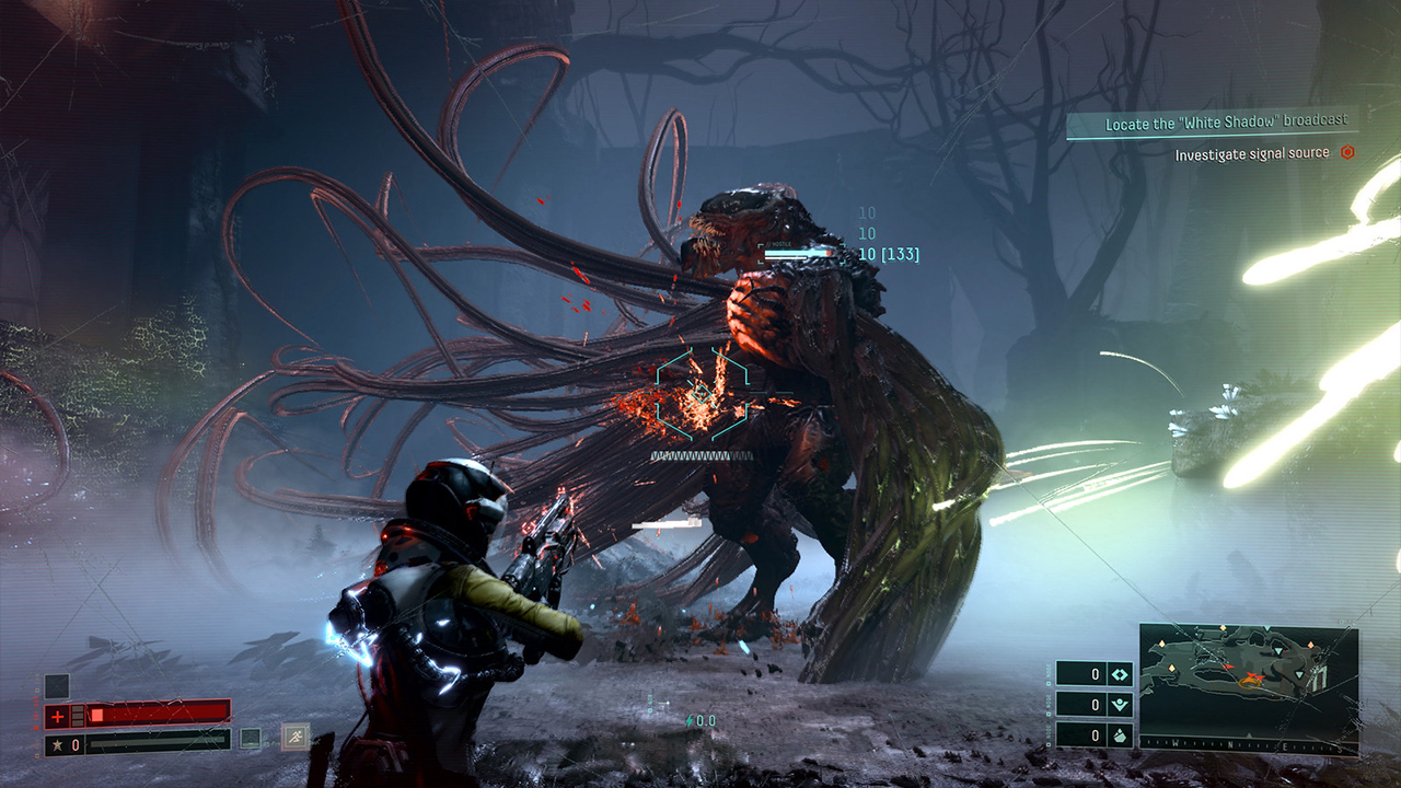 مبارزاتی که در یک سوی آن شخصیت اصلی بازی و قدرتهای جذاب و سلاحهای قدرتمندش قرار میگیرند و در سوی دیگر آن طیف وسیعی از موجودات بیگانه که به روشهای مختلف سر راه بازیکن ظاهر میشوند و شما را به یک چالش نفسگیر دعوت میکنند. از هیولاهای بزرگی که تمام صفحه را پر میکنند و به سختی میتوان حملات آنها را جاخالی داد گرفته، تا موج پرجمعیتی از نوعی پرندهی فضایی که طبق الگوهایی غیرقابل پیشبینی به طور معلق در هوا جابجا میشوند و به سمت شما تیر شلیک میکنند. همانند آنچه در سری بازیهای Doom تجربه کرده بودیم، در بازی Returnal هم باید بدون وقفه و با سرعت بسیار زیادی بپرید، جاخالی دهید، جابهجا شوید و شلیک کنید. به طوری که تنها چند ثانیه ثابت ماندن در گوشهای از محیط احتمالا موجب از پا درآمدن یا حداقل آسیب دیدن شما و خالی شدن نوار آدرنالین خواهد شد.