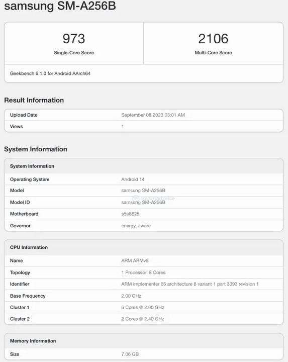 گلکسی A25 طبق تصویر منتشر شده از گیکبنچ، گوشی اقتصادی با تراشهی نسبتا قدرتمند خواهد بود. پردازندهی به کار رفته در این گوشی اگزینوس ۱۲۸۰ سامسونگ است که از ۶ هسته با فرکانس ۲ و ۲ هسته با فرکانس ۲٫۴ گیگاهرتز بهره میبرد. در کنار این تراشه از ۸ گیگابایت رم در قدرتمندترین مدل استفاده شده تا بدین ترتیب کاربران اصلا هیچ نگرانی در رابطه با عملکرد سختافزاری در این بازهی قیمتی نداشته باشند.