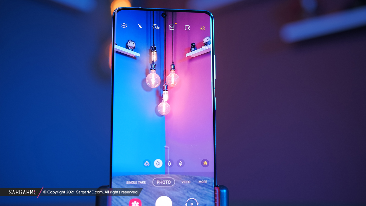 حداکثر روشنایی نمایشگر گلکسی اس ۲۱ اولترا به رقم حیرتانگیز ۱۵۰۰ نیت میرسد که البته باز هم در انحصار محتوای HDR است. خارج از آن، روشنایی صفحه در شدیدترین میزان نور آفتاب به کمی بیش از ۱۰۰۰ نیت میرسد که هنوز هم تحسینبرانگیز است. اگر میزان نور صفحه را به طور دستی روی حداکثر قرار دهید، بیشینهی روشنایی حدود ۴۵۰ نیت خواهد بود که اگرچه بهترین نیست، اما قطعا راضیکننده است. سامسونگ در سالهای اخیر از اشباع رنگهای صفحات امولد گوشیهای خود کاسته و همین روند در اس ۲۱ اولترا هم ادامه پیدا کرده است. امکان انتخاب میان دو مود رنگی Vivid و Natural وجود دارد که مود نچرال با دقت بسیار خوب، رنگهای زنده و نزدیک به واقعیت را بازتولید میکند. مود Vivid همانطور که از نامش پیداست، اشباع بیشتر و دقت کمتری دارد و خصوصا رنگ سفید در آن بهطور پیشفرض کمی مایل به آبی است، اگرچه کاربر میتواند گرمی رنگها را بنا به دلخواه خود افزایش دهد. یک گزینه جدید با رابط کاربری One UI 3.1 به این بخش اضافه شده که Eye Comfort Shield نام دارد و در واقع همان فیلتر آشنای حذف نور آبی برای محافظت از چشم است. ابتکار سامسونگ در این زمینه، تنظیم شدت نور آبی براساس زمان در روز است؛ با تاریک شدن هوا، نمایشگر میزان نور آبی را به حد کمینه میرساند. امکان تنظیم یک مقدار ثابت هم وجود دارد.