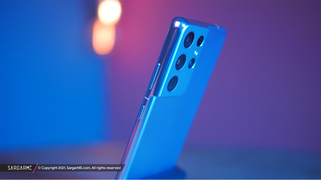 نقطه تمایز بزرگ اس ۲۱ اولترا و در واقع کل سری اس، طراحی متفاوت پشت بدنه و مشخصا، ماژول دوربین است. سنسورهای دوربین حالا به جای آن که ناحیهای جزیرهمانند را در بالای بدنه اشغال کنند، روی برشی بزرگ و قطور شبیه به یک استیج اختصاصی قرار گرفتهاند. این همان بخشی است که سامسونگ آن را کنتور کات نامیده است. ناحیهی دوربین، برشی با لبههای تیز دارد که با انحنایی نرم و ملایم با فریم بالا و راست گوشی ادغام میشود. یکپارچگی این بخش با فریم و تفکیک بُرندهی آن با بدنهی پشت گوشی، این حس را منتقل میکند که انگار تمام بدنه با تراش دادن ظریفانهی یک شمش آلومینیوم بهدست آمده است. چینش لنزهای دوربین در دو ستون عمودی است که در ستون سمت چپ، لنز اصلی ۱۰۸ مگاپیکسلی، لنز ۱۲ مگاپیکسلی فوق عریض و لنز تلهفوتوی پریسکوپی قرار گرفتهاند. ستون سمت راست به ترتیب میزبان ماژول فوکوس لیزری، فلش LED و لنز زوم ۳x است. انحنای لبههای بدنهی گلکسی اس ۲۱ اولترا چندان زیاد نیست و این نکته در ترکیب با ناحیهی بسیار برجستهی دوربین باعث شده که گوشی جلوهای حجیم و بزرگ داشته باشد. جنس بدنه از شیشهی مقاوم و بسیار چشمنوازی است که علیرغم جنسش، کاملا مات است.