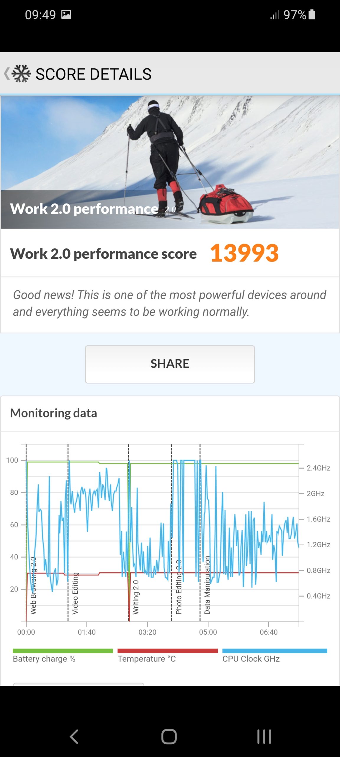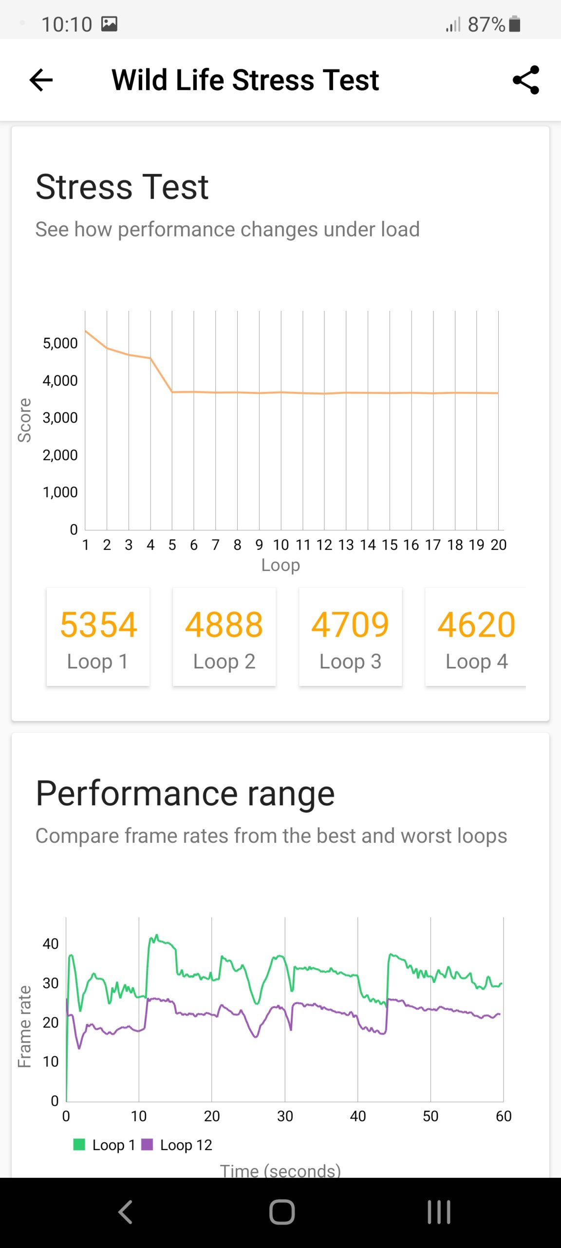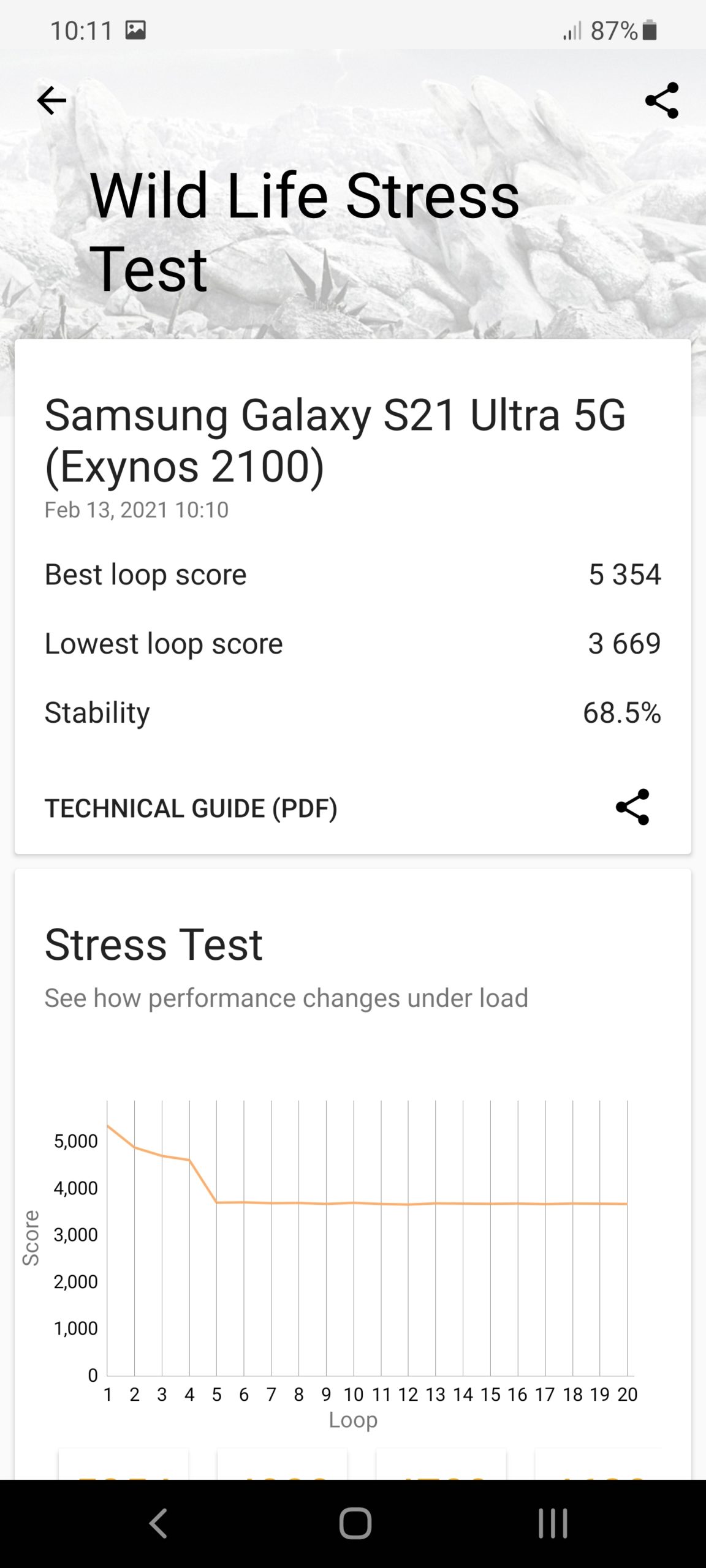 استرس تست وایلد لایف، یک بنچمارک سنگین بیست دقیقهای است که توان گرافیکی دستگاه و عملکرد آن در زمینهی پایداری نرخ فریم، مصرف باتری و افزایش دمای کارکرد را میسنجد. نتایج گلکسی اس ۲۱ اولترا در این بنچمارک امیدوارکننده است. با وجود افزایش قابلتوجه دما تا ۴۵ درجهی سانتیگراد، ۶۸.۵ درصد پایداری عملکرد توسط این گوشی ثبت شده که رقم مناسبی برای یک پرچمدار است.