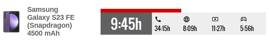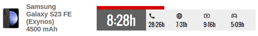 تستها نشان داده که مدل اسنپدراگون توانسته زیر فشار مختلف از جمله وبگردی، تماشای ویدیو از یوتیوب و انجام بازی، در مجموع و به صورت متوسط ۹ ساعت و ۴۵ دقیقه دوام داشته باشد اما این میزان برای مدل اگزینوس، ۸ ساعت و ۲۸ دقیقه بوده است. بدین ترتیب احتمال اینکه گلکسی اس ۲۳ فن ادیشن مجهز به اسنپدراگون بتواند یک روز را به سختی دوام بیاورد بیشتر از نسخهی اگزینوس است. به تفکیک عمکلرد هم میتوانید وضعیت دو مدل را در زیر ببینید.