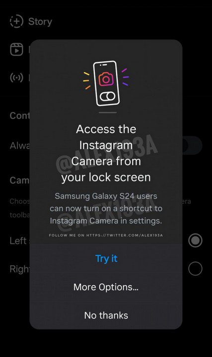 در این حالت وقتی اینستاگرام را برای اولین بار روی گوشی گلکسی اس ۲۴ اجرا کنید، یک پاپآپ برایتان به نمایش در میآید مبنی بر اینکه آیا میخواهید روی صفحهی قفل به دوربین اینستاگرام دسترسی داشته باشید؟ اگر روی گزینهی Try it کلیک کنید، این گزینه به صفحهی قفل اضافه خواهد شد. گزینهی More Options هم به شما اجازه میدهد یک سری تنظیمات را روی آن اعمال کنید که بعد از عرضهی رسمی سری اس ۲۴ میتوان کاملا متوجه گزینههای مربوط به آن شد.