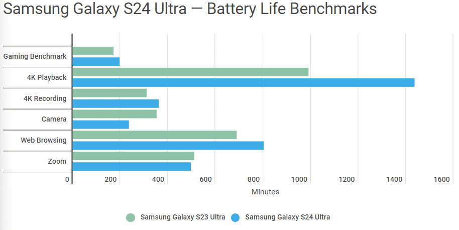 با این حال به صورت کلی، اس ۲۳ اولترا از لحاظ باتری اگرچه گوشی فوقالعادهای است اما حریف اس ۲۴ اولترا نمیشود. به صورت متوسط، پیشرفت اس ۲۴ اولترا از لحاظ باتری ۱۰٪ در تمام بخشها بوده که برای پیشرفت نسل به نسل، خوب است. این میزان تفاوت در عمل، یعنی حدودا ۳۰ دقیقا تا ۱ ساعت شارژدهی بیشتر در انجام کارهای معمولی.