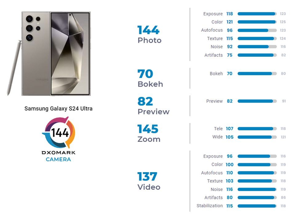 گلکسی اس ۲۴ اولترا توانست تستهای Dxomark را با کسب امتیاز 144 پشت سر بگذارد. امتیاز خوبی است اما نه در مقایسه با بهترین پرچمدارهای حال حاضر بازار. سامسونگ با توجه به تستهای Dxomark، هیچوقت در زمینهی دوربین حریف رقبای قدری چون هواوی، اپل و گوگل نبود؛ اما کاربران این شرکت امیدوار بودند این بار وضعیت متفاوتی را شاهد باشند که اینطور نشد.