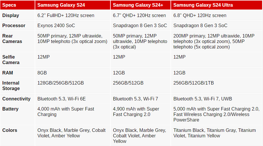 مثلا نمایشگر +QHD، پردازندهی اسنپدراگون ۸ نسل ۳، حافظهی ۲۵۶/۵۱۲ گیگابایتی، ۱۲ گیگابایت رم و شارژر ۴۵ واتی. مدل استاندارد اما نمایشگر +FHD، حافظهی ۱۲۸ گیگابایتی، ۸ گیگابایت رم و پردازندهی اگزینوس ۲۴۰۰ (در بازارهای بینالمللی) خواهد داشت. شما میتوانید در جدول بالا مشخصات سه گوشی را با هم مقایسه کنید.