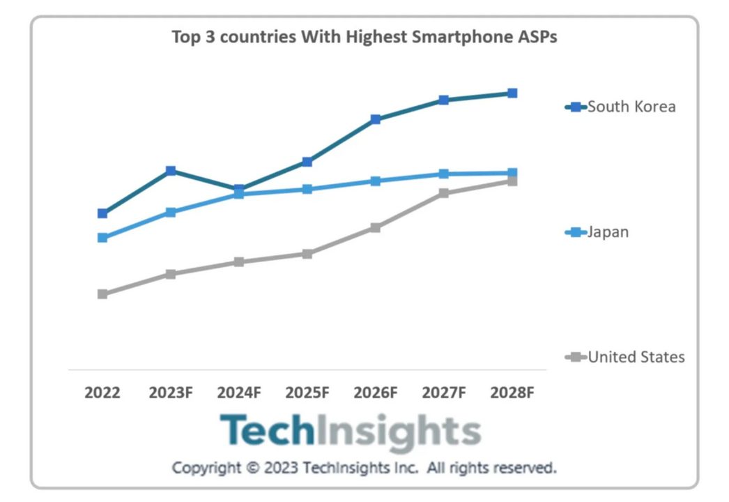 اما به تازگی شاهد انتشار گزارشی از سوی موسسهی آماری TechInsights بودیم مبنی بر اینکه در کدام کشور، قیمت متوسط گوشیهای خریده شده توسط کاربران بیشتر است. این مقایسه بین چند کشور صورت گرفت که سه کشور برتر از این حیث کرهی جنوبی، ژاپن و آمریکا بودند. این یعنی در کشور کرهی جنوبی، مردم تمایل بسیار بیشتری به خرید گوشیهای پرچمدار یا به طور کلی گرانقیمت دارند تا میانرده یا اقتصادی.