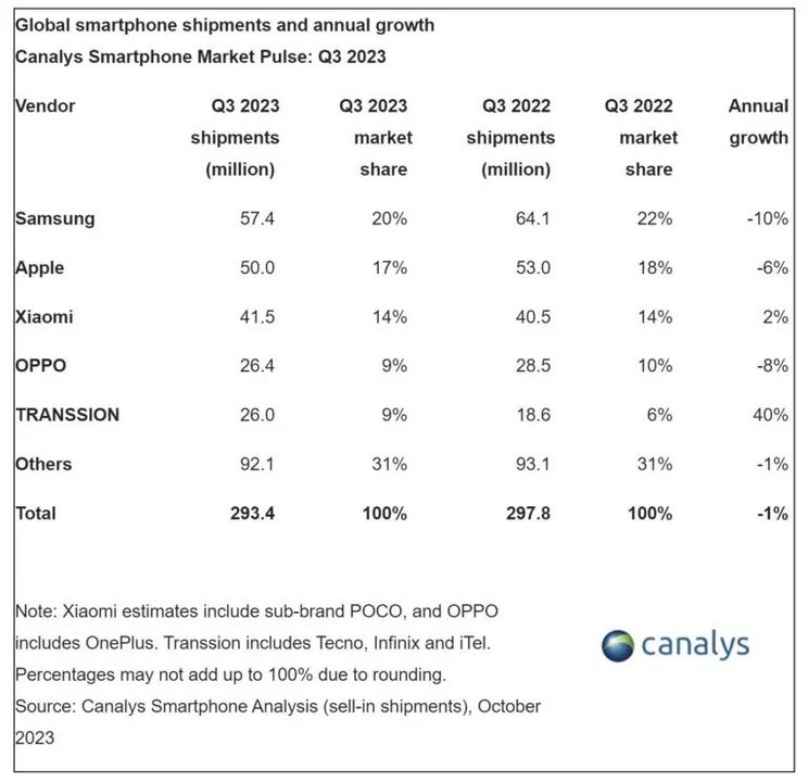 شیائومی (و ردمی و پوکو)، اوپو (و وانپلاس) و شرکت TRANSSION (شامل تکنو، اینفینیکس و آیتل) هم به ترتیب جایگاه سوم تا پنجم را هر یک با سهم 14 و 9٪ به خود اختصاص دادهاند. آمار فروش گوشیهای این شرکت هم در سه ماه سوم سال ۲۰۲۳ به ترتیب ۴۱٫۵ میلیون، ۲۶٫۴ میلیون و ۲۶ میلیون بوده است.