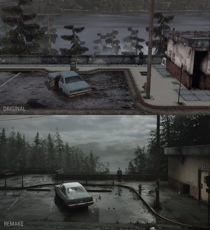 حالا یکی از طرفداران مجموعه سایلنت هیل در تاپیک r/Gaming فروم ردیت (Reddit) با نام کاربری nesatzuke یک تصویر منتشر کرده است که به مقایسه گرافیک ریمیک Silent Hill 2 با نسخه اصلی آن میپردازد. این عکس یک صحنه مشابه را هر دو نسخه اصلی و ریمیک این اثر نشان میدهد. با نگاه به این تصویر بلافاصله میتوان تفاوت وضوح بین دو نسخه را مشاهده کرد، همچنین جنگلهای سرسبز بازی بازسازی شدهاند و در مقایسه با تنها چند درختی که در نسخه اصلی وجود داشتند، شاهد یک جنگل بزرگتر هستیم. همچنین نورپردازی بازی به طور چشمگیری بهبود پیدا کردهاند و بازتابهای قابل مشاهده آن در ساختهی استودیوی بلوبر تیم به ایجاد حس ترس قابل لمس در صحنههای مختلف کمک بسیاری میکند و این یکی از دلایلی است که نشان میدهد چرا بسیاری از تیمهای توسعهدهندهی بازیهای ترسناک به سراغ استفاده از موتور Unreal Engine 5 در پروژههای آینده خود رفتهاند. شما در زیر میتوانید تصویری را که این طرفدار منتشر کرده است، مشاهده کنید: