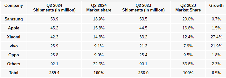 در میان شرکتهای تولیدکننده گوشیهای هوشمند، سامسونگ و اپل همچنان در صدر پرفروشترین برند گوشی قرار دارند. همچنین تمامی پنج شرکت برتر در این حوزه توانستهاند میزان فروش خود را افزایش دهند. بر اساس گزارش IDC، افزایش قیمتهای میانگین و استفاده از هوش مصنوعی از دلایل اصلی بهبود بازار بین ماههای آوریل و ژوئن 2024 بودهاند.