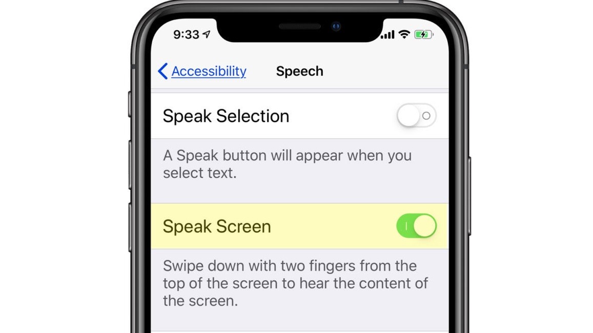 - در گوشی آیفون: مسیر Settings > Accessibility > Spoken Content > Speak Selection را دنبال کنید. پس از فعال شدن، میتوانید بخشی از متن را هایلایت کنید و روی دکمه Speak کلیک کنید تا بخش مورد نظر شما از متن خوانده شود. اگر Speak Screen را فعال کرده باشید، میتوانید با کشیدن دو انگشت به پایین، محتوای کل صفحه را بشنوید. از سوی دیگر، میتوانید از دستیار صوتی سیری بخواهید که محتوای هر صفحه را برای شما بازخوانی کند.