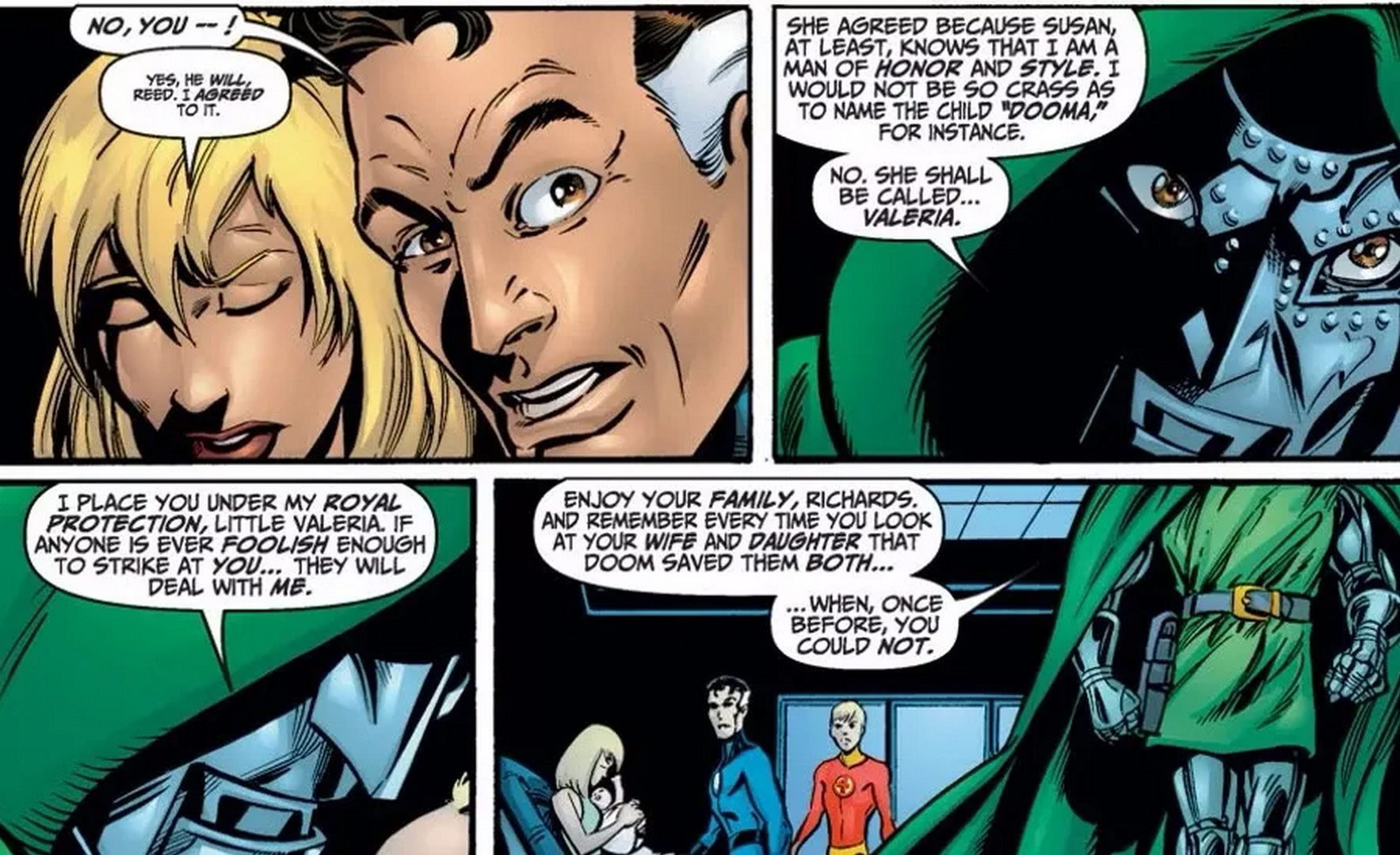 در یکی از صمیمیترین و دور از انتظارترین لحظات دنیای مارول، دکتر دووم نقش یک قهرمان واقعی را ایفا میکند؛ آنهم نه در میدان نبرد، بلکه در اتاق زایمان! وقتی رید ریچاردز در مأموریتی گرفتار شده و سوزان استورم در آستانه بهدنیا آوردن فرزند دوم خود است، جانی استورم به سراغ دشمن دیرینهشان میرود؛ دکتر دووم. برخلاف انتظارات، او بیدرنگ کمک میکند، شخصاً زایمان را به انجام میرساند و نوزادی سالم را به دنیا میآورد. تنها خواستهاش؟ انتخاب نام کودک. او نام «والریا» را برمیگزیند؛ اسمی که بعدها معنایی بسیار عمیق برایش خواهد یافت.
