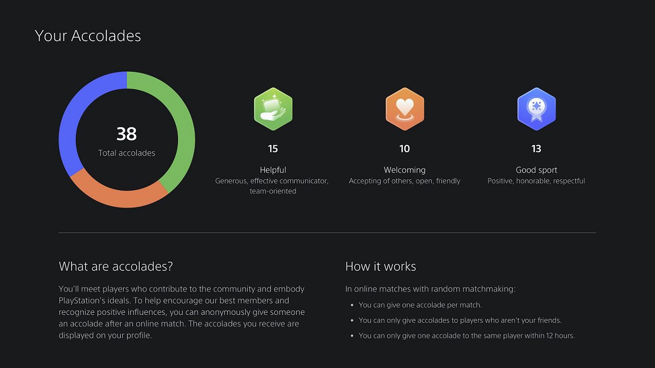 از پاییز سال جاری میلادی، پشتیبانی از قابلیت Accolades در پلی استیشن 5 به پایان میرسد. آن طور که انتظار داشتیم، از این ویژگی چندان استقبال نشد و بازیکنان زیادی از آن استفاده نمیکنند. به همین خاطر، ما از این پس روی پشتیبانی از این بخش تمرکز نمیکنیم. با این وجود، ما همچنان جامعه خود را به ارسال پیامهای مثبت به سایر بازیکنان تشویق و دعوت میکنیم.
