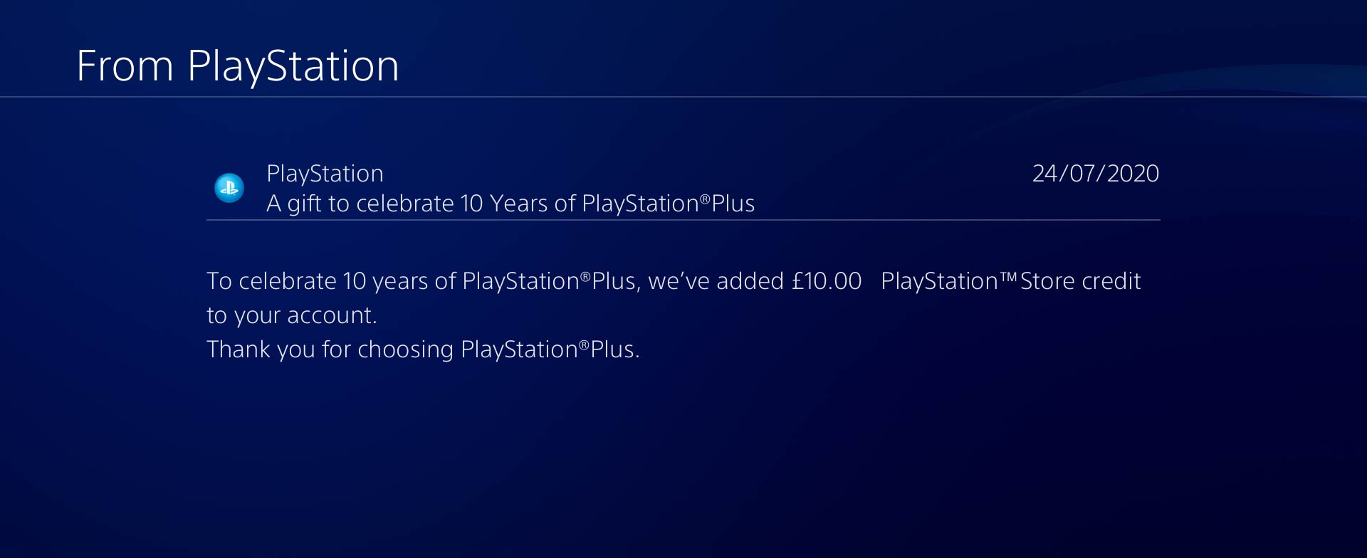 سونی در نظر دارد تا با ارسال اعتبار رایگان برای کاربران سرویس پلیاستیشن پلاس، ده سالگی این سرویس را جشن بگیرد. با استناد به گزارشات منتشر شده در Reddit، سونی برای افرادی که هماکنون اشتراک فعال پلیاستیشن پلاس را دارند، اعتبار رایگان ارسال میکند. در آمریکا این اعتبار ۱۰ دلار، در انگلستان ۱۰ پوند و برای کشورهای اروپایی این مقدار ۱۰ یورو خواهد بود.