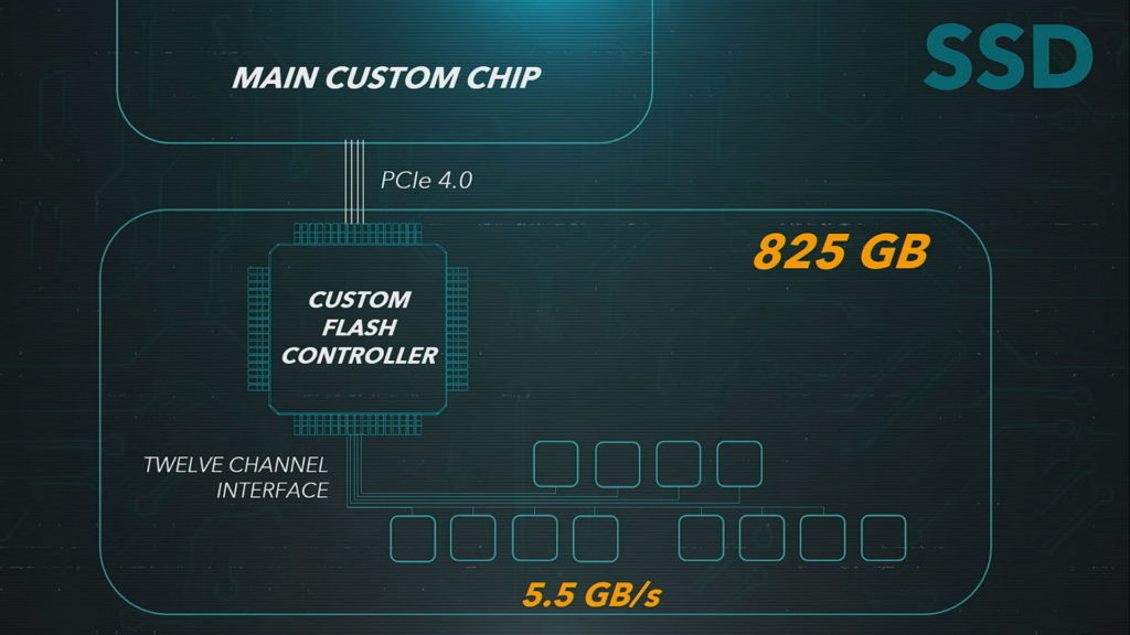 سونی در این راه از یک کنترلر فلش شدیدا تغییریافته استفاده کرده که عملا درایوها را با استفاده از یک رابط ۱۲ کاناله، عملا با پردازنده یکی میکند. تیم طراحی به این نتیجه رسیده که میزان ظرفیت مناسب برای چنین سیستمی، ۸۲۵ گیگابایت است که به نظر رقم عجیبی است، اما به گفتهی سرنی این مقدار مطلوبترین تعادل میان هزینهی گزاف تولید فناوری فلش و سازگاری با رابط را فراهم میکند. نتیجهی این موارد، تعداد زیادی مزیت است. طبیعتا بزرگترین آنها، سرعت بسیار بالای اجرا و بارگذاری بازی است، به طوریکه محیط بازی به شکل آنی در هنگام حرکت کاراکتر لود میشود و تقریبا دیگر چیزی به نام زمان انتظار برای Fast Travel وجود نخواهد داشت. اما این همهی موارد نیست. فناوری پیشرفتهی SSD در پلیاستیشن 5 باعث میشود دیگر نیازی به نصب پچهای متعدد وجود نداشته باشد و استفادهی بهینهای از حافظهی دستگاه صورت بگیرد. با وجود تمام این بهبودهای شگرف، سرنی و تیم طراحی مهمترین مزیت این سیستم جدید را آسودگی و آزادیعمل ساخت بازی برای توسعهدهندهها میداند تا بدون پیچیدگی بتوانند بهترین عملکرد را روی دستگاه به دست آورند.