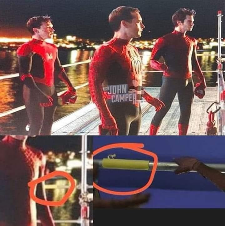 در نگاه اول شاید به نظر برسد تصاویر جعلی باشند اما برخی از کاربران به بررسی آنها پرداخته و با نکات جالبی مواجه شدند. در تصویر شماره یک که هر سه مرد عنکبوتی حضور دارند، روی نرده نواری دیده میشود. این نوار در یکی از تصاویر قدیمی که از پشت صحنه لو رفته بود هم وجود دارد. دیگر نکته مهم، به تصویر شماره دو و کفش پیتر پارکر مربوط میشود. او همان کفشی را به پا دارد که در یکی از پلانهای اولین تریلر پوشیده بود. در ادامه میتوانید نتیجه بررسیها را مشاهده کنید: