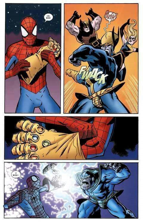 در کمیک Avengers Annual #7 تانوس سعی داشت با استفاده از قدرت سنگهای ابدیت (قبلا با نام Soul Gems نیز شناخته میشد) تمامی ستارگان موجود در کهکشان را منفجر کند. اما وقتی این نقشه توسط کاپیتان مارول، انتقام جویان و آدام وارلاک به شکست انجامید، تانوس تصمیم گرفت خورشید واقع در منظومه شمسی را از بین ببرد. پیتر پارکر که بهطرز غیرمنتظرهای توسط دو موجود کیهانی معروف به Lord Chaos و Master Order از این اتفاق باخبر شده، با کمک ثینگ خود را به سفینه فضایی تانوس میرساند. سپس با ترکیبی از قدرت اراده، شانس و شجاعت، مرد عنکبوتی موفق میشود از سنگ روح درجهت آزاد کردن روح آدام وارلاک و کشتن تانوس استفاده کند.