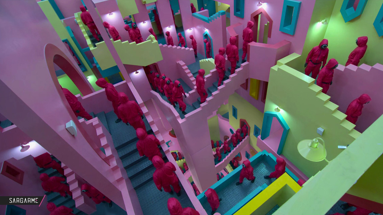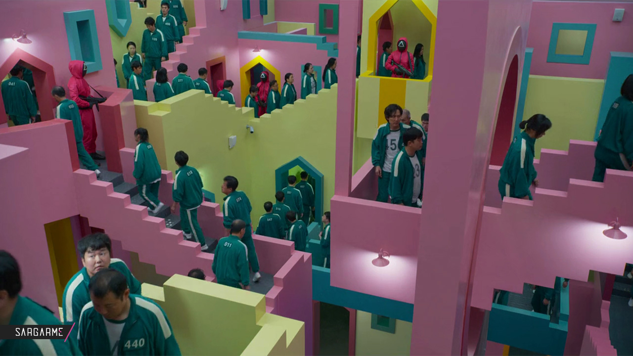 کافکا میگوید دنیای جدید (منظور زندگی دنیوی)، مثل دهلیز پرپیچ و خمی است که انسان در آن گم میشود. جالب است که قبل و بعد از انجام هر بازی، بازیکنها برای رسیدن به محیط جدید یا استراحتگاه باید یک مسیر پر پیچ و خم را طی کنند. کارگردان سریال توانسته این حسِ پر پیچ و خم بودن را با فیلمبرداریهای جالب و تدوینهای هوشمندانهاش به خوبی به نمایش بکشد. این مولفه تا انتهای سریال بارها تکرار میشود تا ناخواسته به این فکر فرو برویم که این همه مسیر را برای چه چیزی میرویم؟ پول؟ که به عقیدهی خیلیها چرکِ کفِ دست است؟ نکتهی جالب اینجاست سریال بازی مرکب به پولْ ارج و قرب میدهد و با نماهایی طرف حساب هستیم که انگار جایزهی میلیاردیِ بازی مرکب، مثل یک خداست و بازیکنها آن را میپرستند و برایاش قربانیهای زیادی هدیه میدهند. گویا این انگیزهی قدرتمندِ بشر است که همیشه از چیزی بت بسازد.