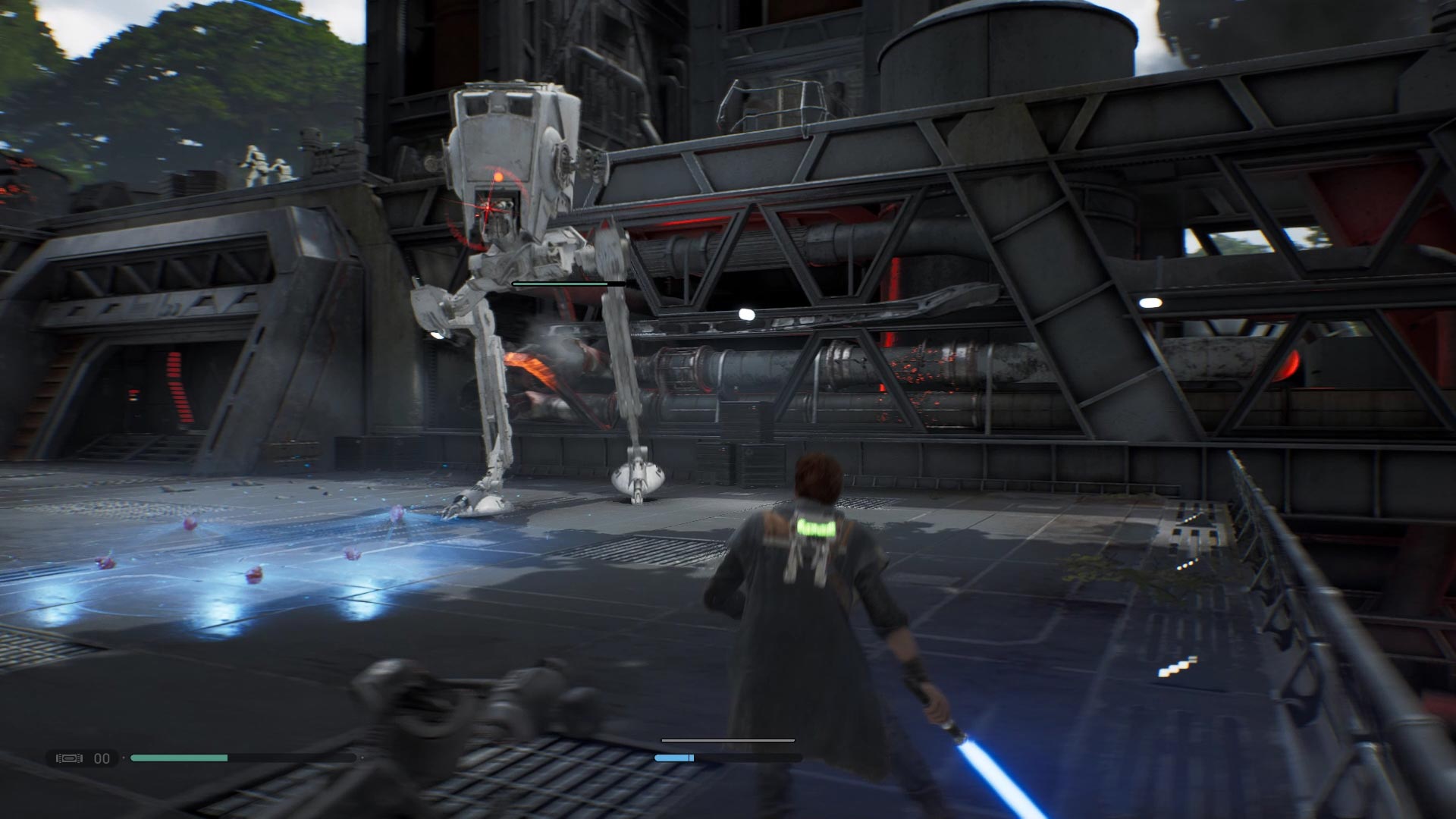 روند بازی در کل به سه بخش مبارزات، پلتفرمینگ و حل معما تقسیم میشود. تقریبا هیچکدام از مکانیکهای بازی منحصربهفرد نیستند و اکثرشان را در بازیهای دیگر دیدهاید. در مبارزات با استفاده از شمشیر نوری معروف جدایها که Lightsaber نام دارد و همچنین تواناییهای وابسته به فورس، به مقابله با دشمنان میپردازید که شامل موجودات و اهالی هر سیاره یا نیروهای امپراتوری هستند. مبارزات به وضوح از عنوان Sekiro: Shadows Die Twice الهام گرفته است؛ با فشار دادن آنالوگ راست روی یک دشمن قفل میکنید، از حملات شدید جاخالی میدهید، قادر به دفاع در مقابل حملات معمول هستید و در صورت یک دفاع به موقع، آن را دفع و ضدحمله را اجرا میکنید که در برخی مواقع به یک فینیشر سینماتیک و جذاب ختم میشود. به طور کلی مبارزات Jedi: Fallen Order را میتوان حالت ساده شدهی مبارزات سکیرو در نظر گرفت. البته فکر نکنید که بازی آسان است و حتی روی درجهی سختی Jedi Master که درجهی میانی به حساب میآید، در نیمهی دوم بازی و با جدیتر شدن مبارزات سختی آنها هم بیشتر میشود و شما را بهویژه در باسفایتها به چالش میکشد. با این وجود اما چالش زیاد برای مخاطب اجباری نیست و میتوانید تجربهای روان و در عین حال لذتبخش از مبارزات داشته باشید. همچنین ترکیبش با قدرتهای وابسته به فورس و حرکاتی چون برگرداندن تیر استورمتروپرها، وجه خاصتری به مبارزات میبخشد. با نابودی دشمنان و باسفایتها امتیاز تجربه کسب میکنید که رسیدنشان به مقداری خاص، امتیاز مهارت به شما میدهد. از امتیازات مهارت میتوانید برای کسب مهارتهای جدید و ارتقای سلامتی و استامینا استفاده کنید، اما این کار در هر لحظه میسر نیست و باید آن را در نقاط مدیتیشن انجام دهید که حکم بونفایرهای سری سولز را در بازی دارد. یکی دیگر از الهامات بازی از سری سولز و عنوان سکیرو در اینجاست؛ در نقاط مدیتیشن علاوه بر خرج امتیاز مهارت، قادر به استراحت خواهید بود که هم نوار سلامتی و فورس را پر میکند، هم دشمنان نابود شده دوباره ظاهر میشوند. بخش پلتفرمینگ چیز خاصی ندارد، اما انیمیشنها حرکت و صحنههای سینماتیک مخاطب را به یاد سری Uncharted میاندازد. مکانیک دویدن روی دیوار هم بهشخصه من را به یاد Prince of Persia میانداخت. بخش حل معما در اکثر موارد به باز کردن یک راه با استفاده از ابزار محیطی محدود میشود که باید در این مواقع از تواناییهای وابسته به فورس در آن استفاده کنید.