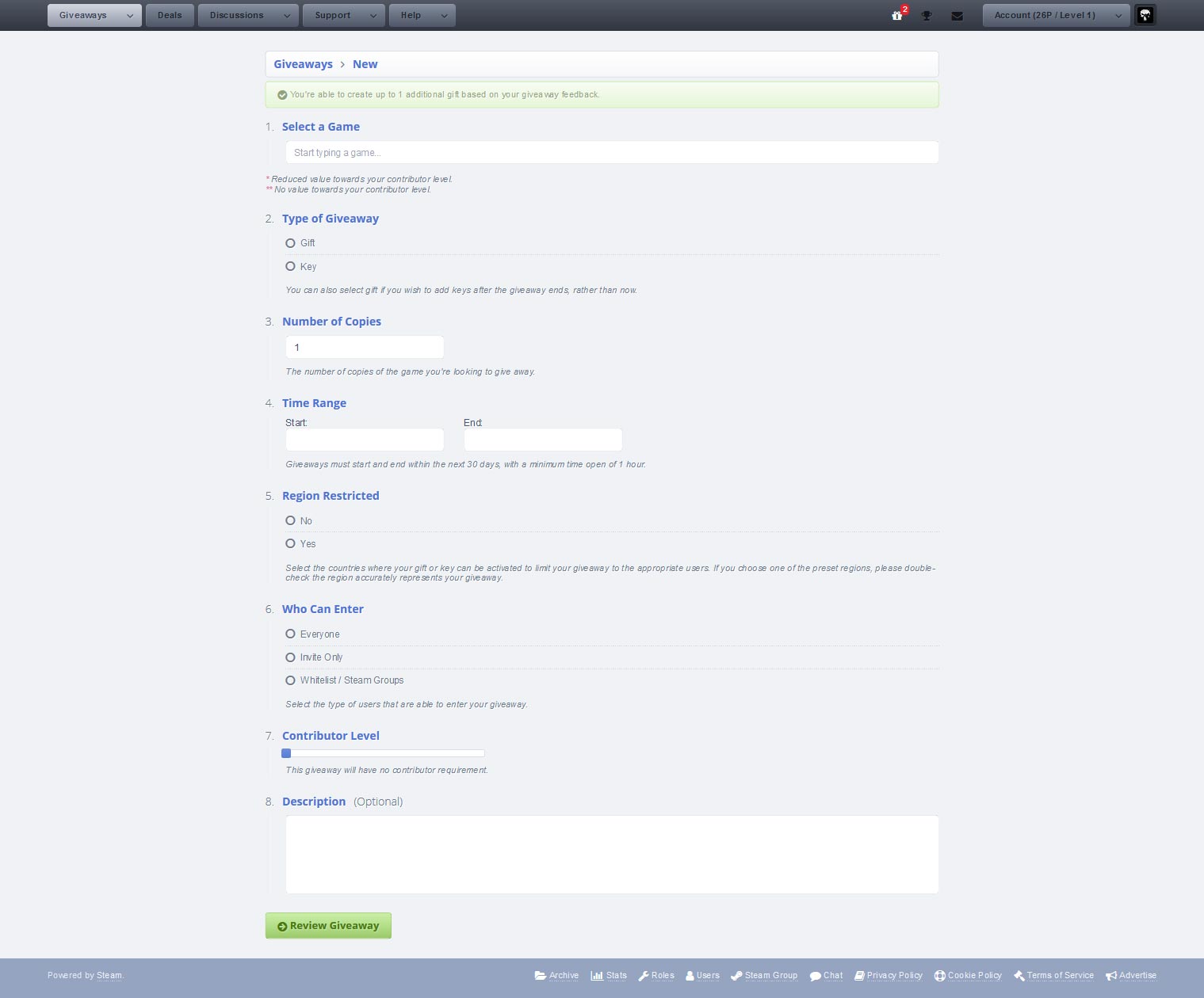 اگر یک گیفت یا کد اضافه از یک بازی دارید و میخواهید آن را به قرعه بگذارید، ابتدا در صفحهی اصلی روی دکمهی Giveaways در گوشهی سمت چپ بالا کلیک و سپس گزینهی Create A New Giveaway را انتخاب کنید. در صفحهی جدید به ترتیب بخشهای زیر وجود دارد: