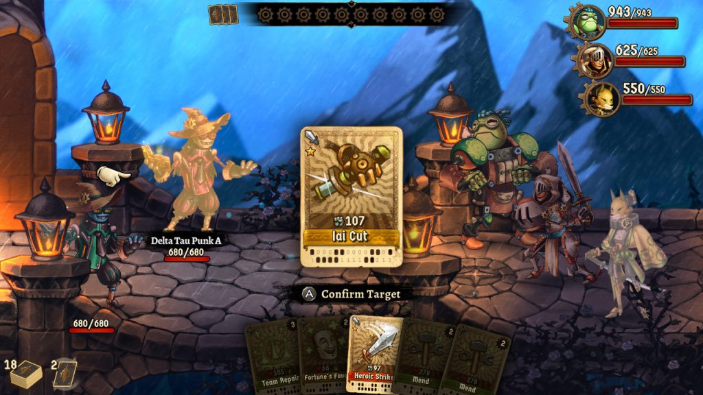 همان طور که گفتیم در نگاه نخست گیم پلی SteamWorld Quest تا حد زیادی به Hearthstone و Elder Scrolls Legends شباهت دارد، در حالی که شباهتهای این بازی با عناوین ذکر شده، تنها به کارت محور بودن آن ختم میشود و گیم پلی بازی SteamWorld Quest: Hand of Gilgamech بیش از هر چیز به بازیهای نقش آفرینی نوبتی مانند سری Final Fantasy و Xenoblade شبیه است. کارتهای موجود در بازی نمایانگر قدرتها و تواناییهای کاراکترهای اصلی هستند و هیچ کدام به عنوان کارت احضار کننده مبارز عمل نمیکنند. پس منتظر نباشید که در این بازی هم مانند Gwent یا Hearthstone با کارتهایتان منجنیق یا اژدها به میدان نبرد بیاورید. با این حال جای هیچ نگرانی نیست. شاید در نگاه اول SteamWorld Quest یک بازی معمولی به نظر بیاید اما گیم پلی روان و متنوع آن به سرعت مخاطبین را به سمت خود جذب میکند.