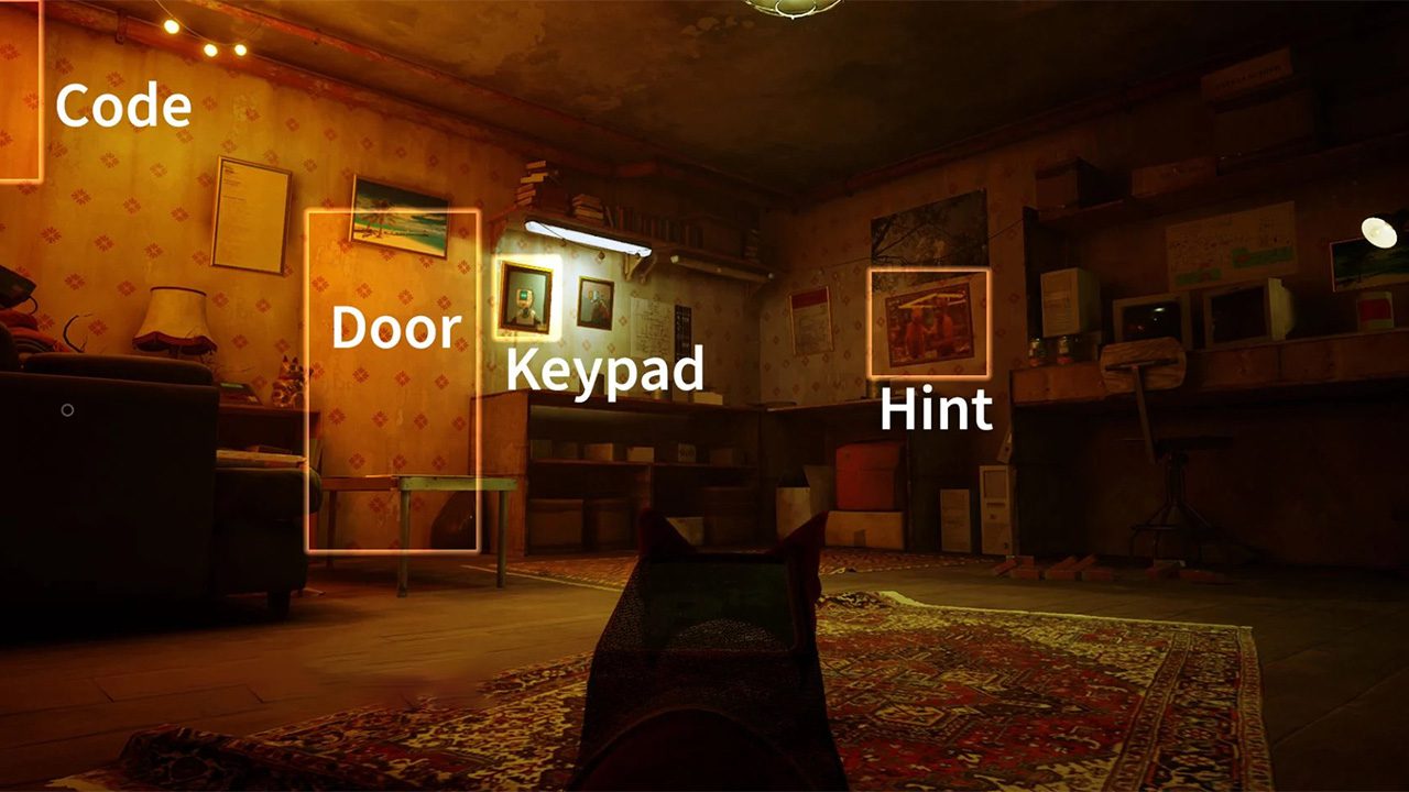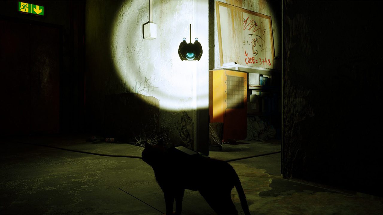 یکی از اولین راه بندهایی که پیش روی شما قرار میگیرد، دری در انتهای راهرویی تاریک است. دوست شما که یک پهباد بامزه است، شما را به سوی صفحه کلیدی که برای بازگشایی در باید از آن استفاده کنید هدایت میکند. پیش از در، اتاقی بسیار تاریک وجود دارد. وارد اتاق شوید و با چراغ قوه پهبادتان اتاق را نورانی کنید. در سمت چپ خود تخته وایت بردی روی قفسه میبینید و بر تخته، نوشتهای قرمز رنگ دیده شده که چند بطری آن را پوشاندهاند. از قدرتهای گربهای خود استفاده کرده، بطریها را کنار بزنید تا نوشته روی تخته نمایان شود. نوشته قرمز رنگ در حقیقت رمز در است. این رمز چهار عددی، ۳۷۴۸ است که آن را در صفحه کلید وارد میکنید و پس از آن در باز میشود.