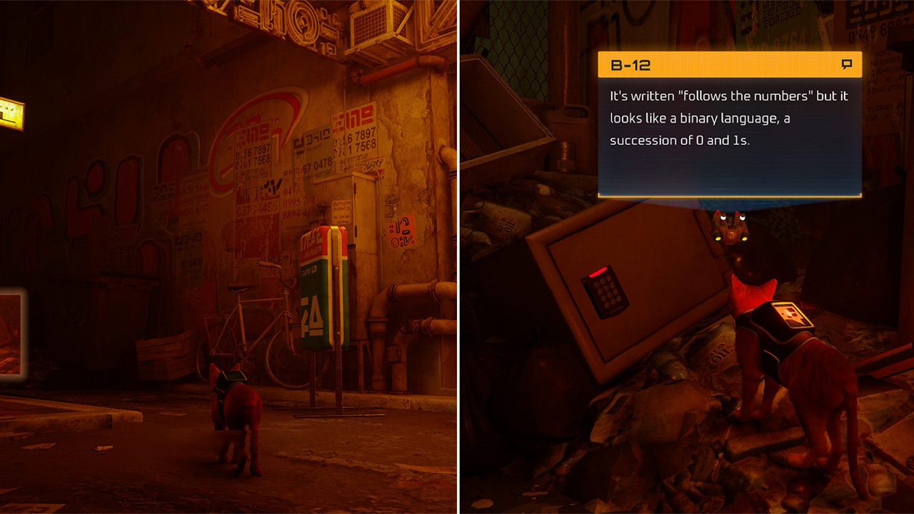 دنیای جذاب بازی Stray، چالشهای جذابی نیز دارد که برخی از آنها بسیار آسان و برخی دیگر سخت و نیازمند کاوش گربهای هستند. بدون شک همه شما در حالی که با گربه دوست داشتنی خود در حال پیش بردن بازی Stray هستید، به پازلهایی برخورد میکنید که میتوانند برای پیشرفت شما حیاتی باشند. این پازلها میتوانند در قالب درهایی ظاهر شوند که حتما باید رمز آنها را بیابید یا گاو صندوقهایی باشند که صرفا پیش برد بازی را جذابتر کرده و از سوی دیگر باز نکردن آنها صدمهای به بازی شما وارد نمیکند. در بازی Stray به طور کلی چهار رمز وجود داشته که تنها دو رمز از میان آنها مربوط به داستان بازی هستند و یافتن آنها چندان آسان نیست!