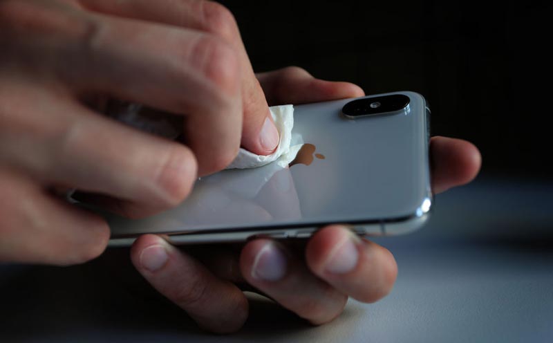 یک پارچه میکروفیبر را با اسپری ضدعفونیکننده (ترجیحاً الکل) مرطوب کنید و مراقب باشید که این پارچه بیش از حد به الکل آغشته نباشد. صفحه گوشی یا تبلت را با ماده ضدعفونی، میکروب زدایی کنید. اجازه دهید اسپری برای مدت زمان کوتاه روی تلفن همراه باقی بماند. صفحه گوشی خود را با یک پارچه تمیز و خشک کنید.