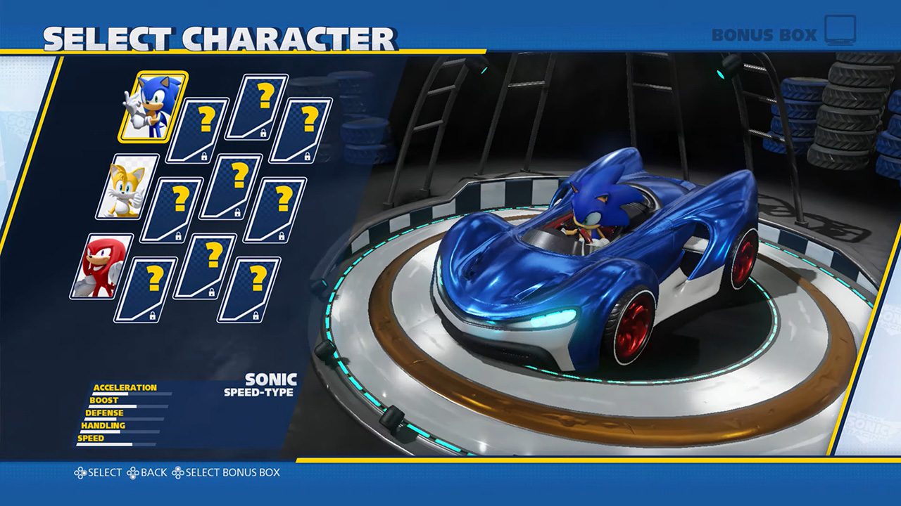 تعداد شخصیتهای قابل بازی در Team Sonic Racing فقط 15 از ۱۵ نفر فراتر نمیرود در حالی که در نسخهی 6 سال پیش آن، بیش از 20 شخصیت برای مسابقه دادن قابل انتخاب بود.