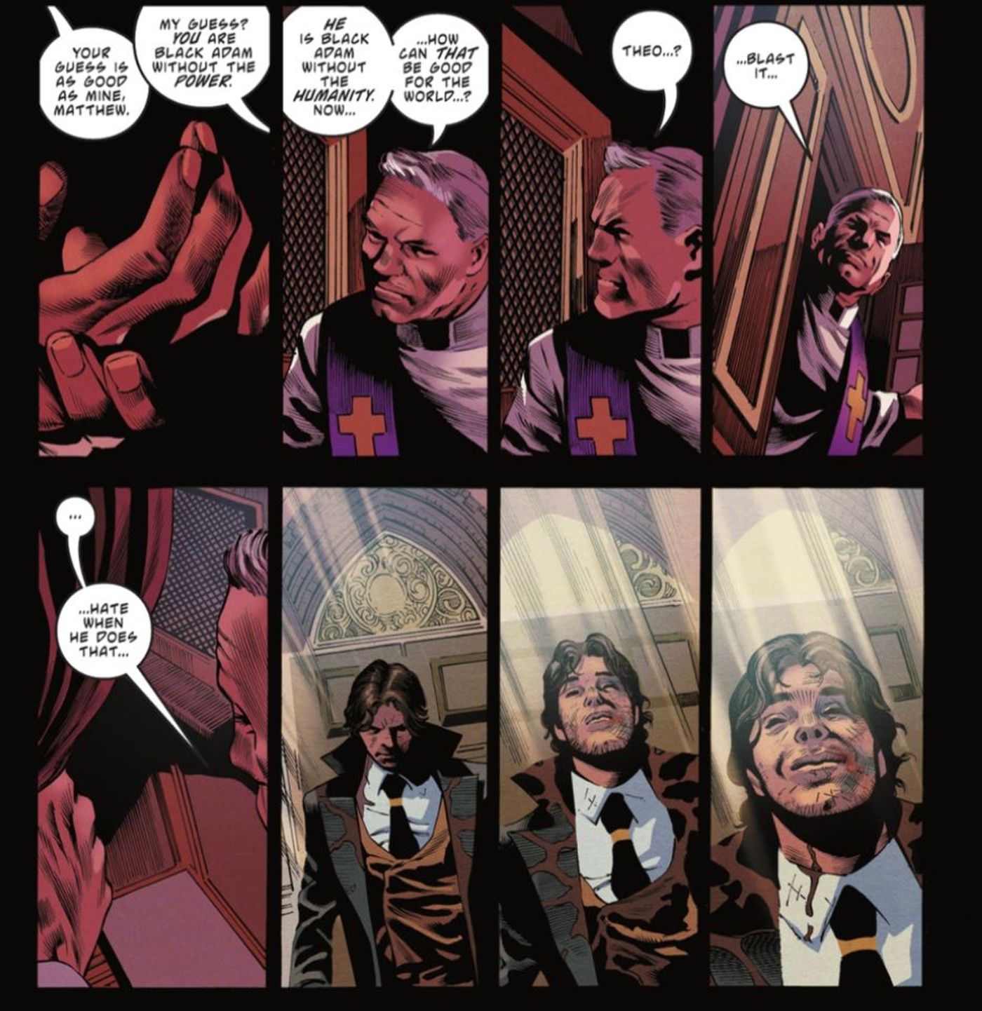 تئو سرانجام میفهمد که هرگز لایق قدرتی که داشت نبود و با جدا کردن خود از نیمه قدرتمندش، میتواند رستگاری پیدا کند. متاسفانه این بدان معنی است که نیمه قدرتمند بلک آدام اکنون در خود اصلا نیمه انسانی را ندارد. در حالی که مطمئناً این موضوع بعداً مشخص خواهد شد ولی در حال حاضر، تئو تس-آدام سرانجام بخشی از سفر بلک آدام را به پایان رسانده است.
