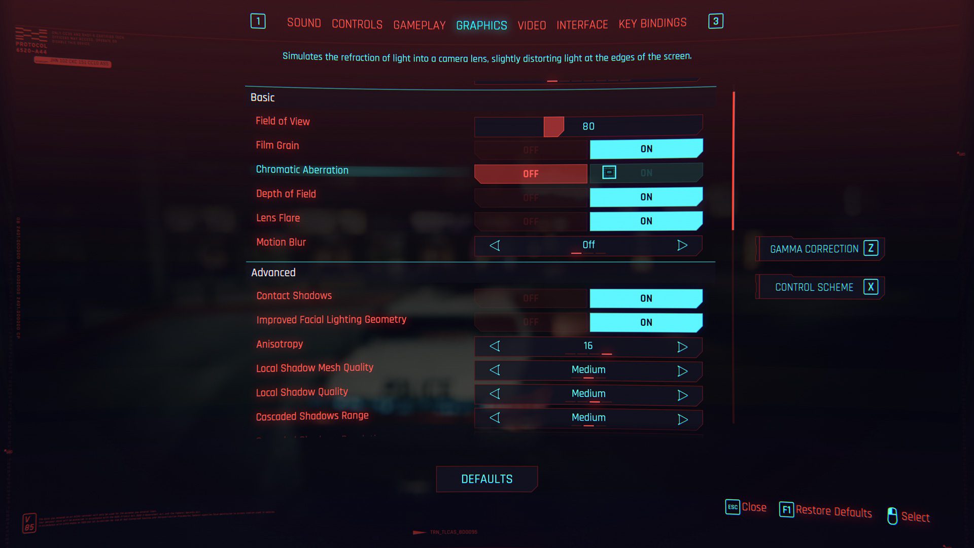 در همین ابتدای کار بگوییم که حتما Chromatic Aberration را خاموش کنید. این گزینه که یکی از آپشنهای تنظیمات Ultra بازی است، در واقع برای این طراحی شده که لبههای صفحه را تار کند تا بازیکن تمرکز بیشتری بر مرکز صفحه داشته باشد. مشکل اینجاست که این قابلیت بیش از حد تصویر را تار کرده و بسیاری از جزئیات را عملا حذف میکند. خاموش کردن یا نکردن این مورد تاثیری بر عملکرد نخواهد داشت، اما قطعا روی کیفیت تصویر تاثیر میگذارد.