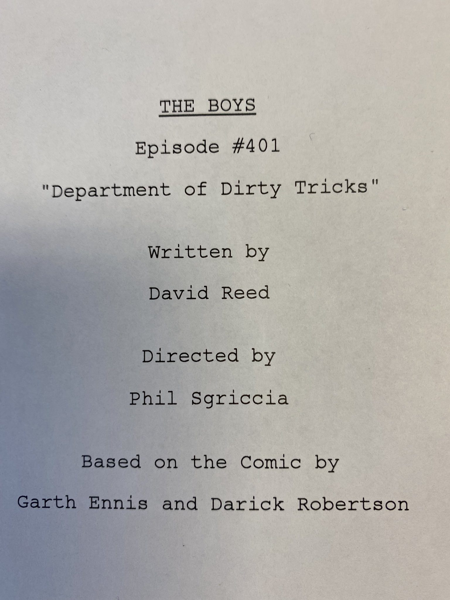 با این حال، بهتازگی Eric Kripke در اکانت شخصی توییتر خود پستی را قرار داده است که نام قسمت اول فصل چهارم سریال The Boys را فاش میکند. این بازیگر در حالی که اغاز فیلمبرداری فصل بعدی بویز را چشن میگیرد، تصویری از جلد فیلمنامه قسمت اول آن را با مخاطبان و طرفداران به اشتراک میگذارد. این تصویر در نخست نام قسمت اول فصل چهارم را با تحت عنوان Department of Dirty Tricks نشان میدهد و در ادامه دیوید رید (David Reed) و فیل اسگریچیا (Phil Sgriccia) را بهترتیب بهعنوان نویسنده و کارگردان این قسمت معرفی میکند.