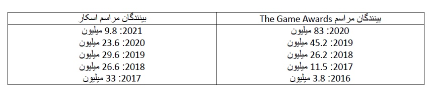 تعداد بینندگان مراسم اسکار ۲۰۲۱ با سقوط آزاد مواجه شده و تنها ۹.۸ میلیون بیننده را بهخود اختصاص داد و این درحالیست که سال ۲۰۲۰ تعداد بینندگان عدد ۲۳.۶ میلیون را بهخود دید. درسوی دیگر و در مراسم The Game Awards، ما شاهد ۸۰ میلیون بیننده در مراسم سال ۲۰۲۰ و ۴۵.۲ بیننده در مراسم سال پیشین آن بودیم. بدون شک بسیاری انتظار مواجهه با این اعداد را نداشته و البته این اعداد نشان از افزایش علاقه جهانیان به بازیهای ویدیویی دارد. تعداد دقیق بینندگان در سالهای اخیر را میتوانید در لیست پایین مشاهده کنید.