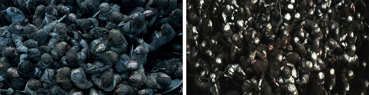 فیلم بهلحاظ جذابیتهای بصری و اجراهای پر زد و خورد، تقریبا هرآنچه را که دارد، برای پایان کار نگهمیدارد و در بدنهی فیلم بهندرت صحنههای کلان و پرجنب و جوش مشاهده میشود. هر چند توزیع سکانسهای محدودی که در فیلم وجود دارند، از وجه عامهپسندانه، کلیت کار را به اثری رضایتبخش تبدیل میکند که نه بیش از حد کند و حوصلهسربر است و نه از اکشن و بزن بزن پر شده! نبرد پایانی تقریبا نقطهی عطف فیلم در پرداخت و اجرای اکشن و صحنههای جذاب پر زد و خورد کلان است. نماها غالبا نماهای آشنایی هستند. حتی در صحنهای که شخصیت بلک در ازدحام جمعیت حاضر در میدان نبرد محاصره شده، یکی از نماهای معروف سریال Game of Thrones عینا تکرار میشود. با این حال، کلیت کار، منجر به خروجیِ رضایتبخش و قدرتمندی شده است. فیلم The King از جهت توزیع اکشن و جلوههای بصری در واقع رویکردی مشابهِ فیلم Outlaw King در پیش میگیرد. البته فیلم بهلحاظ ساختاری، چند قدم عقبتر از Outlaw King قرار گرفته است.