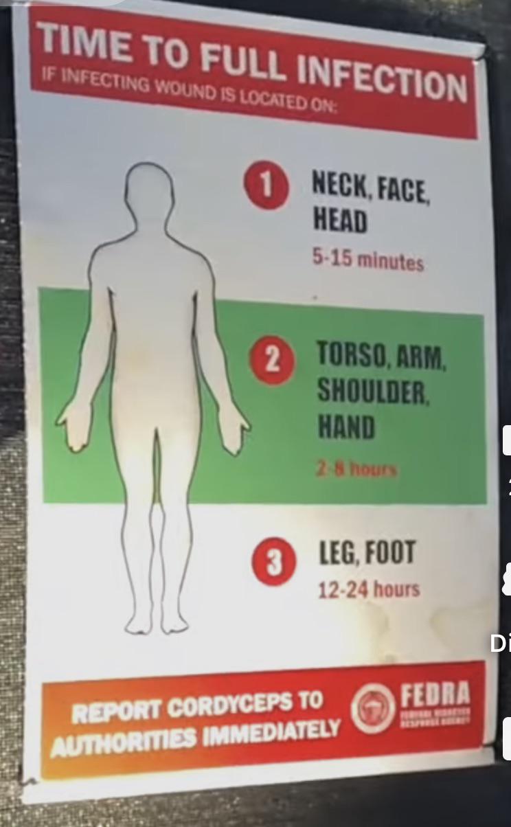 این پوستر به سه بخش تقسیم شده و هر بخش توضیح میدهد که بسته به این که دقیقا کجای بدن فرد توسط زامبیها گاز گرفته شده است، چه مدت زمانی طول میکشد که او به طور کامل آلوده شود و به یک زامبی تبدیل شود.