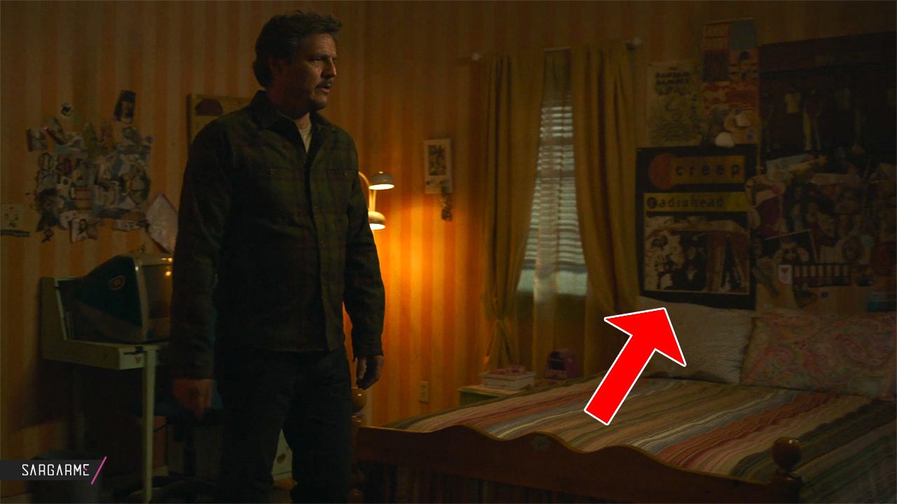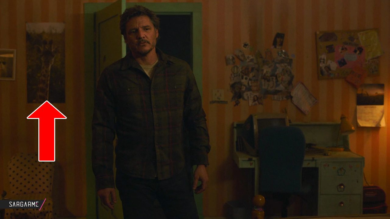 دیگر پوستر دیده شده در اتاق، پوستر زرافه بود. در دنیای د لست آف آس ما شاهد غلبه طبیعت بر بشر هستیم و این موضوع یکی از تمهای اصلی داستان د لست آف آس است. اگر بازی The Last of Us Part 1 را تجربه کرده باشید، صحنه رویارویی الی و جوئل با زرافهها را بدون شک به خاطر دارید و این صحنه که احتمالا در قسمتهای آتی فصل اول شاهدش خواهیم بود، به نحوی با تماشای پوستر زرافه به ما یادآوری شد. نا گفته نماند که در قسمتهای ابتدایی سریال شاهد عروسک زرافه بر زمین افتاده نیز بودیم!