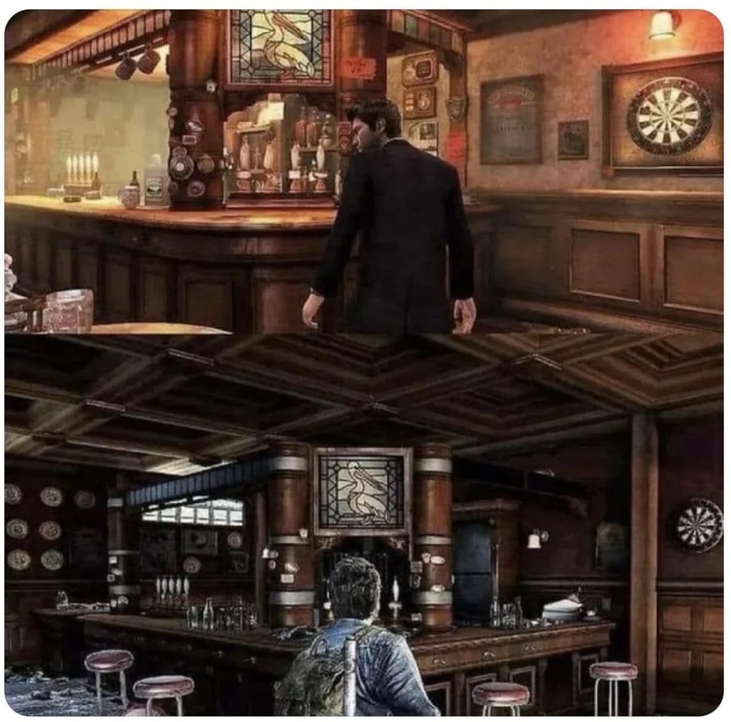 کاربری به نام jynx33 در سابردیت مجموعه The Last of Us متوجه مکانی در بازی Uncharted 3: Drake’s Deception شده که عین آن در بازی The Last of Us نیز وجود دارد و بدون شک یک ایستراگ تعمدی از سوی اعضای استودیو ناتی داگ محسوب میشود. در مرحله اول بازی Uncharted 3: Drake’s Deception پلیرها یک کافه را ملاقات میکنند و همین کافه عینا در بخش انتهایی مرحله پیتسبورگ از بازی The Last of Us وجود دارد. از نحوه طراحی قفسهها و چیدمان ظروف در بخش فوقانی کافه و همچنین وجود یک صفحه دارت، آنقدر شباهتهای موجود در بین این دو صفحه زیاد بوده که میتوان نتیجه گرفت که دقیقا با یک محیط یکسان طرف هستیم.