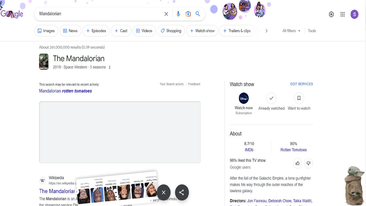 به مناسبت آغاز پخش فصل جدید The Mandalorian، ایستراگ بیبی یودا در موتور جستجو گوگل قرار گرفته است. برای مشاهده این ایستراگ کافی است عبارتی مرتبط با این سریال محبوب را جستجو کنید تا پس از مدت کوتاهی، بیبی یودا در نقطهای از صفحه نمایش ظاهر شود. در صورتی که نشانگر ماوس را روی این کاراکتر محبوب برده و رویش کلیک کنید، او با استفاده از نیرو تغییراتی را در صفحه به وجود میآورد؛ برای مثال، بیبی یودا در تصویر زیر باعث شد بخش مربوط به بازیگران سرنگون شود. در ضمن، نخستین باری نیست که گوگل برای تبلیغ یک سریال با شرکتی همکاری میکند. پیش از این، ایستراگ مشابهی برای تبلیغ سریال The Last of Us در موتور جستجو قرار گرفته بود. نکته جالب اینجا است که پدرو پاسکال در این اثر هم نقش اصلی را بر عهده دارد.