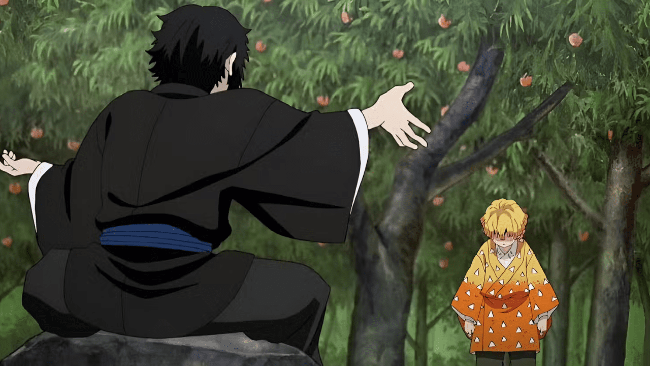 تا حد قابل توجهی از حضور کایگاکو در گذشته زینتسو رونمایی میشود. آنها تحت نظر هاشیرا باد تعلیم میبینند. کایگاکو مانند گذشته یک کیمونو مشکی را بر تن دارد، با این تفاوت که گردنبند مثلثی او یک تغییر جزئی داشته است. به نظر میرسد کایگاکو از زنیتسو متنفر است، چرا که تحت هر شرایطی زنیتسو در حال گریه و زاری است و از طرفی دیگر تنها میتواند یک فرم تنفس را به کار گیرد. علیرغم اینکه کایگاکو با زنیتسو بد رفتاری میکرد، زنیتسو از او کینه به دل نمیگرفت. حتی زمانی که کایگاکو به سمت زنیستو میوه پرتاب کرده و به او میگفت کمپ تمرینات را ترک کند، زنیستو از جای خود تکان نمیخورد، چرا که معتقد است گفتههای او درست میباشند.
