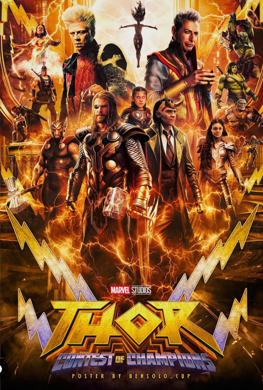 بااینکه هنوز هیچ چیزی توسط مارول تایید نشده، اما یکی از طرفداران بااستعداد که قبلا پوسترهای جذاب زیادی خلق کرده، دوباره دست به کار شده و با خلق پوستری زیبا، فیلم جدید ثور را به تصویر کشیده است. او پنجمین قسمت از فرانچایز ثور را Contest of Champions نامیده که در کمیکها یکی از بزرگترین و محبوبترین خطوط داستانی خدای رعد و برق است. اگر به تصویر زیر دقت کنید، میتوانید شخصیتهای نمادین زیادی مثل بتا ری بیل، هالک، اسکار (فرزند هالک)، اریس (خدای جنگ) و اترنیتی (قدرتمندترین موجود هستی که در پایان فیلم Thor: Love and Thunder نیز حضور داشت) را ببینید.