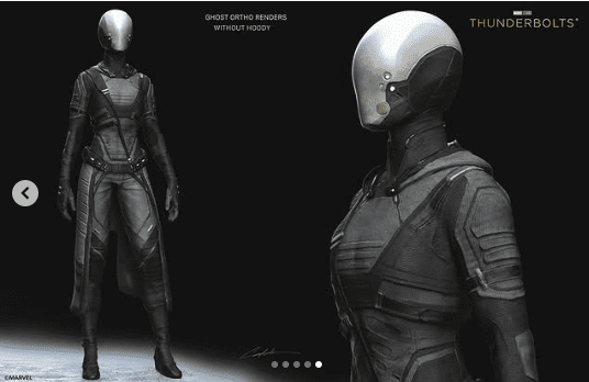 ظاهر Ghost در این طراحیها دارای کلاهخودی با ساختاری متفاوت و رنگآمیزی خاصتری نسبت به نسخه نهایی فیلم است. چنین تغییراتی به وضوح نشان میدهد که تیم طراحی مارول گزینههای متعددی را برای رسیدن به ظاهر نهایی بررسی کرده است.