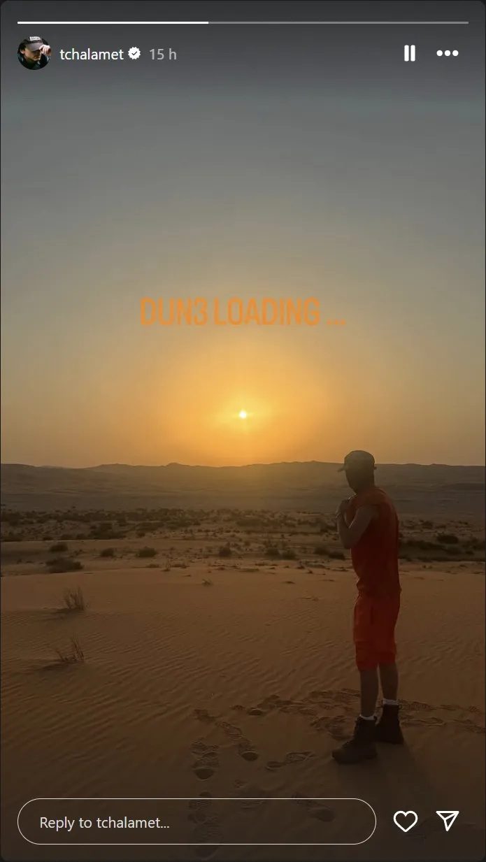 تیموتی شالامه (Timothée Chalamet) به مناسبت بازگشت به صحرای آراکیس و ادامه روند تولید قسمت سوم از مجموعه سینمایی Dune تحت عنوان Dune: Messiah تصویری از پشت صحنه آن منتشر کرده است. ایشان این تصویری را در حساب کاربری خود در شبکه اجتماعی اینستاگرام به اشتراک گذاشته و علیرغم آن که علنا هیچ نکته قابل توجهی در این تصویر وجود ندارد، باری دیگر به مخاطبین یادآوری میکند که آخرین قسمت از این سهگانه سینمایی تا چه اندازه در وضعیتی مورد انتظار قرار دارد.