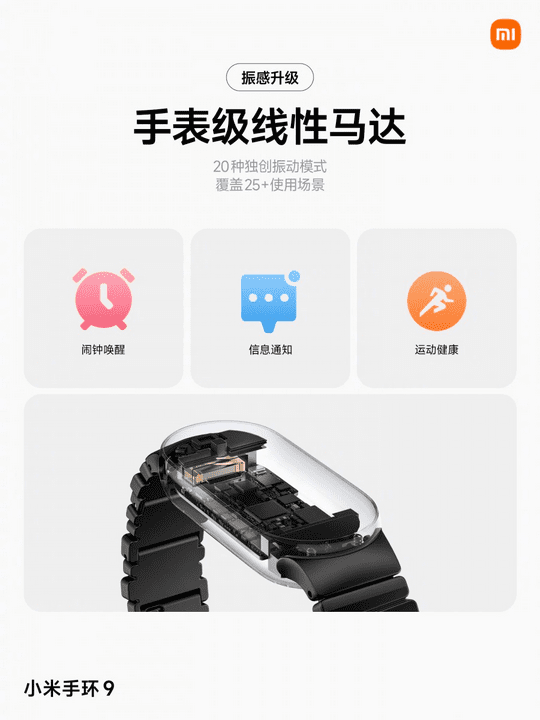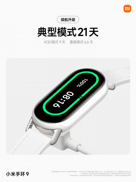 شیائومی اعلام کرده شیائومی بند 9 میتواند در صورت استفاده سبک تا 21 روز شارژدهی داشته باشد. این در حالی است که نمایشگر همیشه روشن اگر روشن باشد، کاربران باید انتظار 9 روز شارژدهی را داشته باشند. این مچبند از یک موتور خطی و 20 حالت لرزشی مختلف هم بهره میبرد تا کاربران بتوانند مطابق سلیقهی خود، موتور لرزشی را تنظیم کنند. نمایشگر این محصول 1.62 اینچی از نوع AMOLED بوده و بیشینه روشنایی آن به 1200 نیت میرسد. همچنین پشتیبانی از بیش از 200 واچفیس و 150 حالت ورزشی هم از دیگر مشخصات این محصول به حساب میآید.